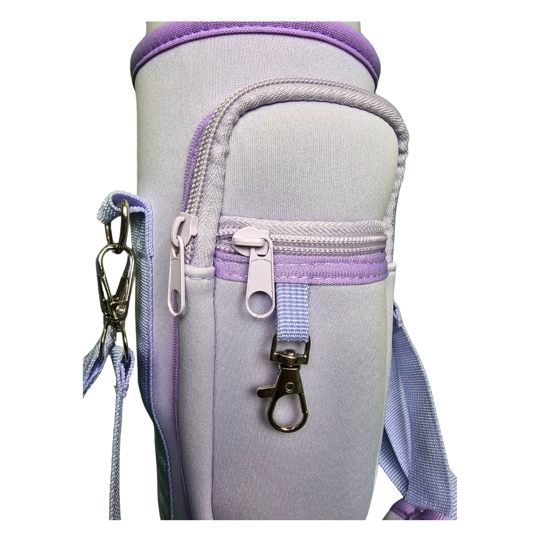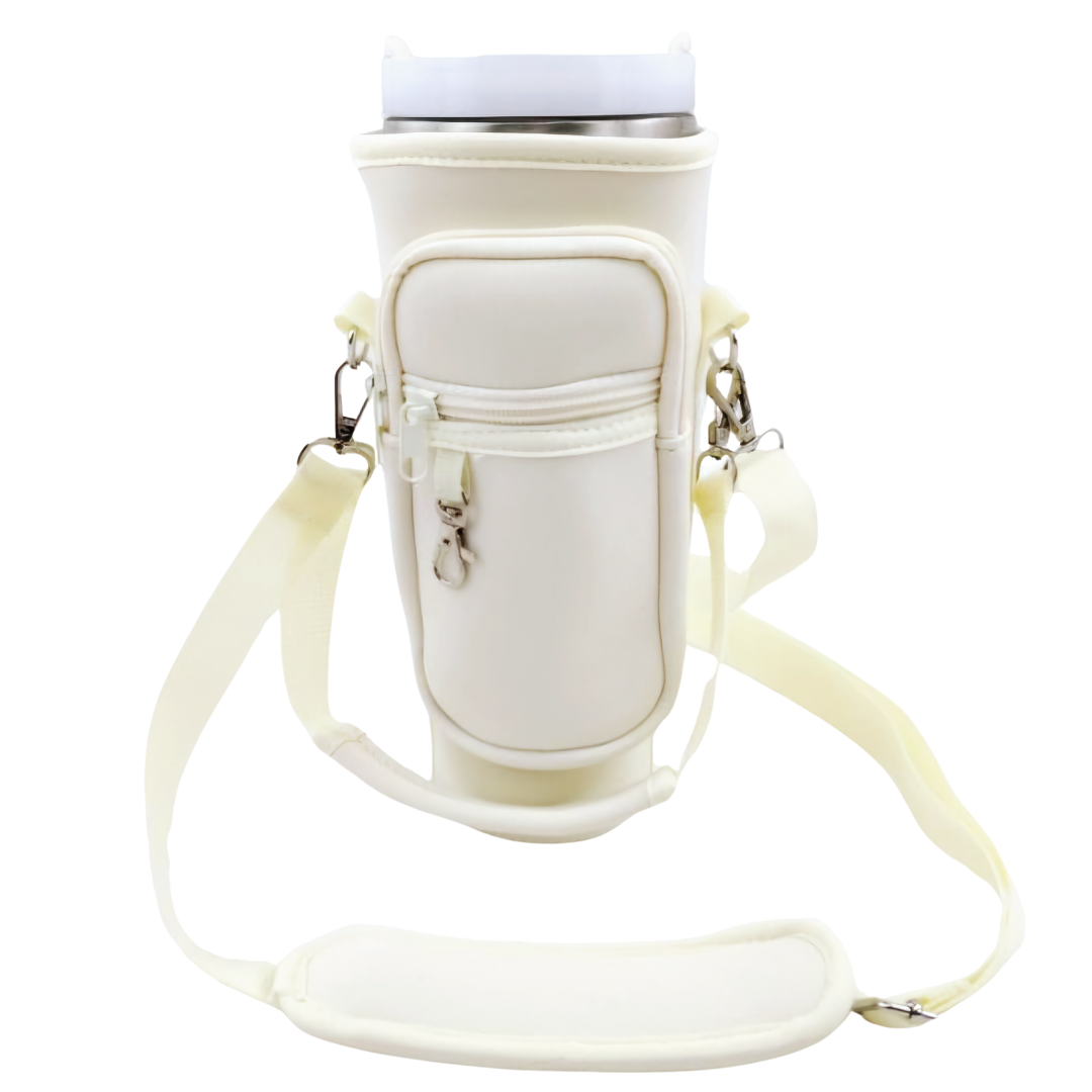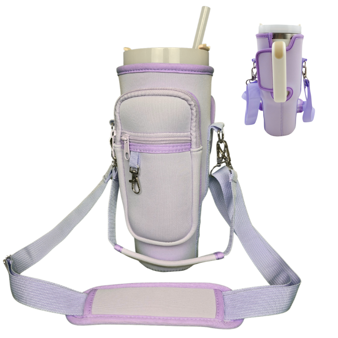 This versatile water bottle carry-all carrier bag keeps your drink within easy reach while keeping your hands free. Made of durable & washable neoprene fabric, it features a padded adjustable strap that allows hands-free carrying over the shoulder or across the body. A large phone pocket pouch fits most larger phones. Additional zippered wallet pocket fits cash & cards with a front clip for keys or ear pods and Stanley accessories. Compatible with most 30-40oz water bottles like Stanley Tumbler and Quencher, an adjustable velcro closure holds your drink securely in place. For added convenience, a hand carrying strap allows for one-handed transport. Lightweight yet hardwearing with durable metal hardware, this water bottle bag keeps essentials close whether commuting, hiking or heading to the gym.